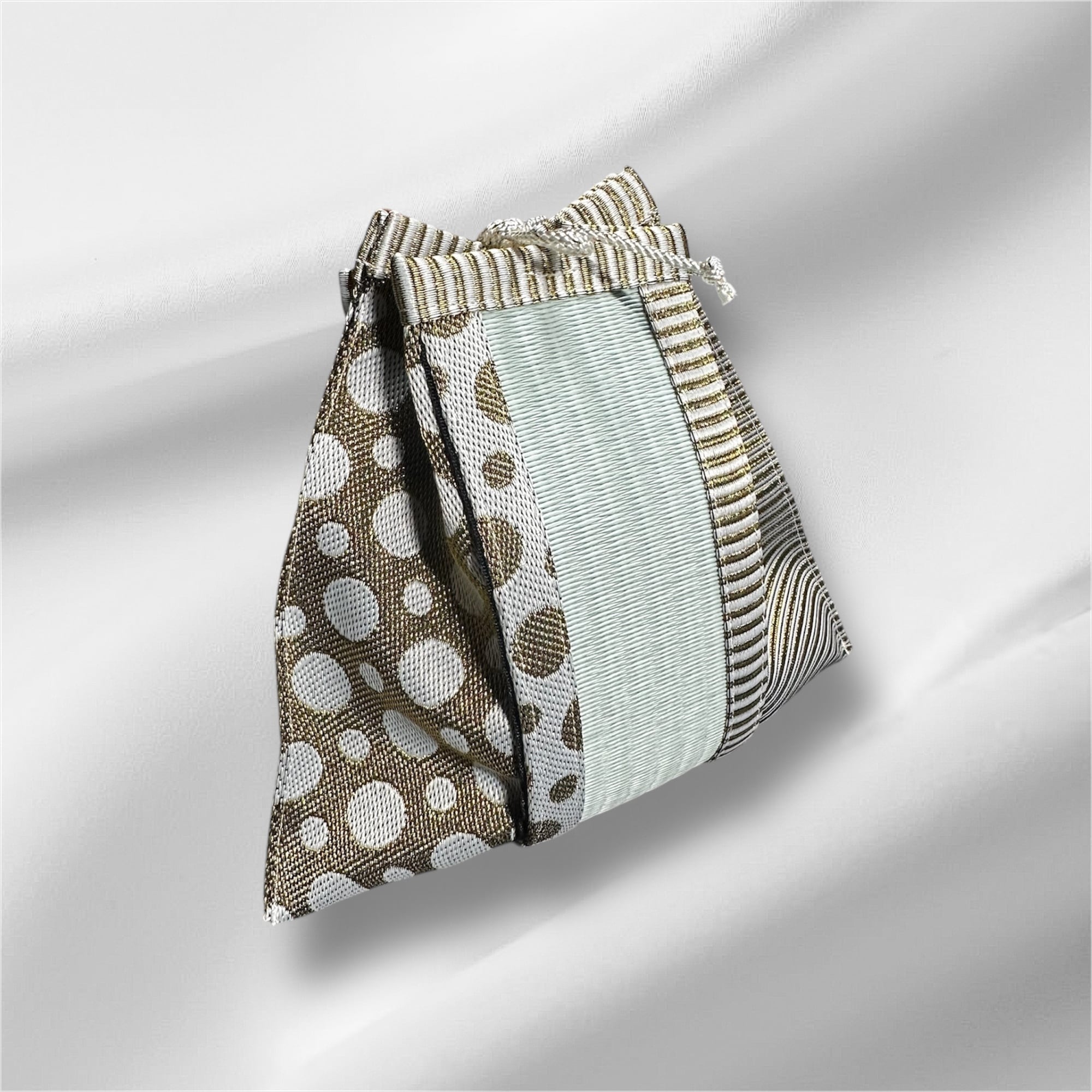 袋の上部はリボン結びをしてもう一度縛るとしっかりと結べて、茶道で使うお仕覆をイメージして作っています
